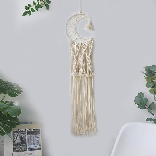 Si tu cherches un Attrape reves Géant à suspendre près de ton lit, sur un mûr ou à côté d'une tenture et que tu es sensible aux multiples bienfaits protecteurs qu'il peut apporter à la qualité de ton sommeil. Alors, découvre notre attrape-rêves lune en macramé. Ces adorables créations te procureront une sensation de calme et de confort. Choisis une lumière douce et tamisée pour obtenir le résultat le plus douillet possible. Créer un décor de maison boho te tient à coeur ? Alors, ne passe pas à côté des Capteurs de rêve étoilés !
